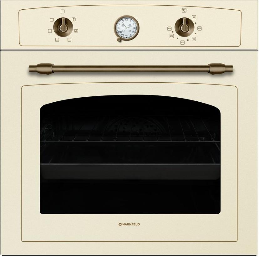 Встраиваемая духовка Электрический духовой шкаф MAUNFELD MEOFE.676RILB2.TMS с передней панелью бежево-золотистого цвета выпускается для использования на домашней кухне и обладает привлекательным ретро-дизайном, являясь удачным решением для кухни в винтажном стиле. Духовая камера данного электроприбора отличается объемом 64 литра и поддается легкой очистке благодаря использованию особой эмали. Она снабжается интегрированным грилем мощностью 1200 Вт, вентилятором охлаждения и системой конвекции, поддерживает нагрев в пределах 300 градусов Цельсия.